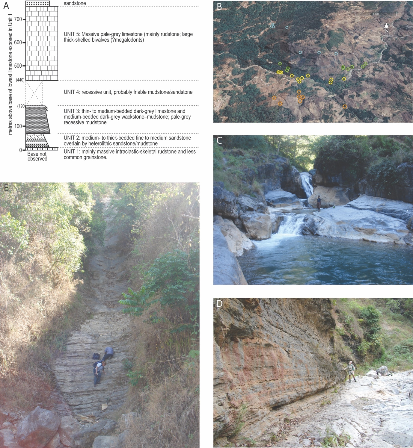 Figure 3.Type area of the Bandeira Formation in Bandeira Gorge (see Fig. 1 for location in Timor-Leste). A, schematic log of a composite type section taken from the northern side of Bandeira Gorge. B, Google-Earth image of the gorge with yellow circles at Unit 1 sampling sites, green circles at Unit 3 sites, blue circles at Unit 5 sites, and orange circles at sites on the southern side of the gorge (see Appendix 2 for locality co-ordinates). C, typical outcrop of Unit 1. D, the contact between Unit 1 and Unit 2 with person standing on contact. E, a section through Unit 3.