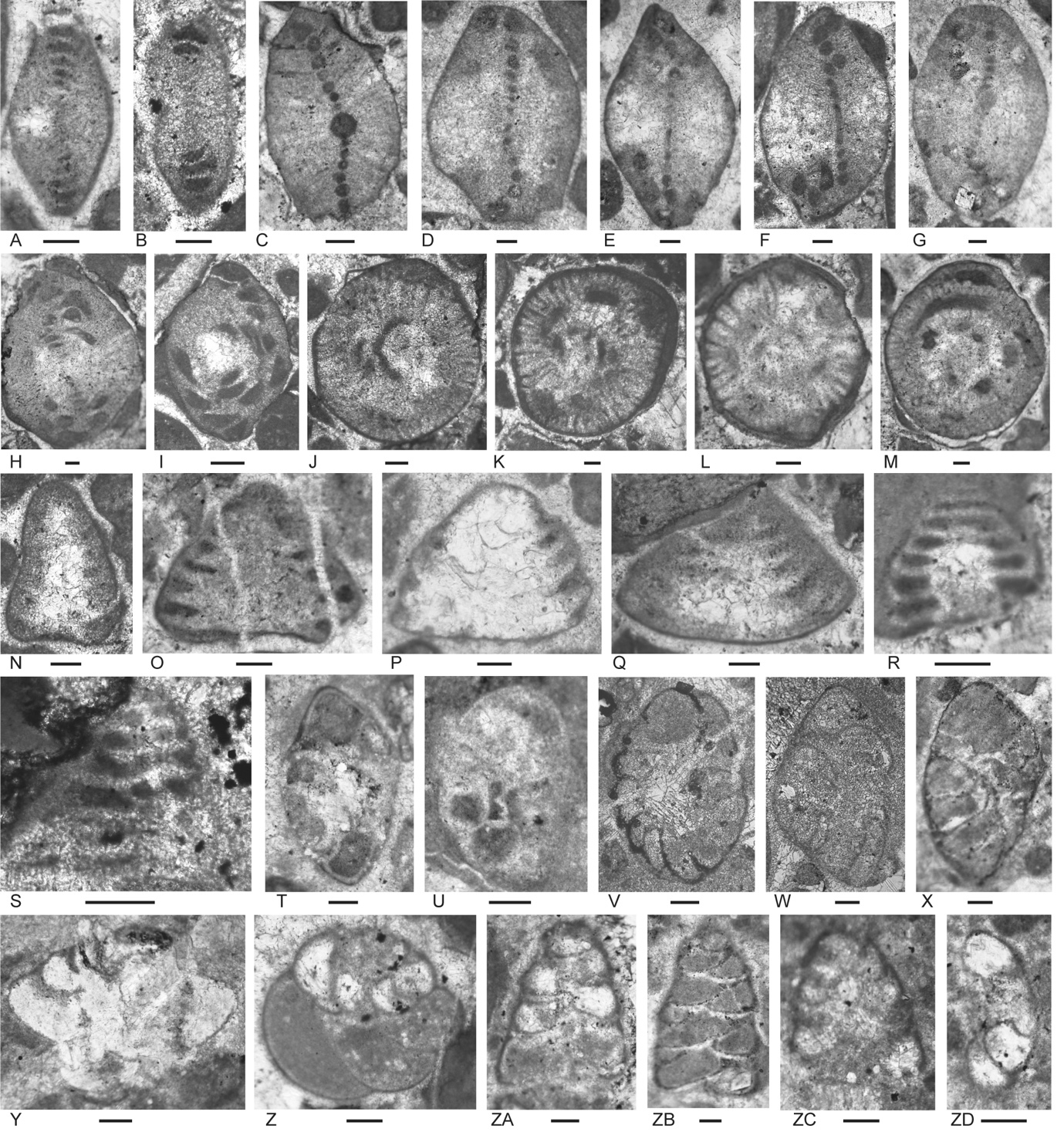 Figure 6.Locality 1, Foraminifera from Unit 3 of the Bandeira Formation at Bandeira Gorge. A–J, carbonate-cemented agglutinated/microgranular species; K–ZA, porcelaneous cornuspiraceans; ZB–ZE, involvutinids; ZF and ZG, nodosariids. Bar scales = 0.1 mm. A–C, Indeterminant glutameandratids, A from Sample 20, B from Sample 21, C from Sample 22. D, Hoyenella vulgaris (Ho), from Sample 23. E, Endoteba sp., from Sample 20. F, Endotriadella aff. wirzi (Koehn-Zaninetti), juvenile test, from Sample 21. G, H, “Siphovalvulina” almtalensis (Koehn-Zaninetti), from Sample 22. I, Indeterminant carbonate-cemented agglutinated species with probable high trochospiral coiling; un-certain because of poor preservation; from Sample 20. J, Indeterminant carbonate-cemented agglutinated species; initial chamber arrangement uncertain but may be triserial although appearing biserial in this off-centred slightly oblique axial section, adult chamber arrangement possibly uniserial, apertural type in adult stage uncertain; not related to the organic-cemented siliceous Gaudryinella Plummer (type species Gaudryinella delrioensis Plummer, Cretaceous); from Sample 21. K, Calcitornella baconica Oraveczné Scheffer, from Sample 21. L, M, Indeterminant involute hemigordiopsid-like species; differs from the type species of Arenovidalina Ho (A. chialingchiangensis Ho, 1959, p. 400, 401, pl. 6, figs 13 holotype, 14–28) by a streptospiral rather than planispiral initial stage; resembles morphotype illustrated by Haig et al. (2018, fig. 4j, from the Lower Permian Fossil Cliff member of the Holmwood Shale in Western Australia, the type level of Hemigordius schlumbergeri (Howchin), the type species of Hemigordius Schubert; L from Sample 20, M from Sample 21. N–R, Atsabella bandeiraensis Haig & McCartain, N–P are free specimens with different views of holotype (N and O) and specimen (P) under glycerine taken in transmitted light, from Sample 33, Q from Sample 22, R from Sample 27. S–W, Karaburunia atsabensis Haig & McCartain, S–U are free specimens with different views of holotype (S and T) and specimen (U) under glycerine taken in transmitted light, from Sample 33, V from Sample 22, W from sample 27. X–Z, Ophthalmidium cf. primitivum Ho, X is a free specimen under glycerine taken in transmitted light, from Sample 33, Y from Sample 23, Z from Sample 22. ZA, Indeterminant ophthalmidiid (?) with evolute sigmoidal coiling, from Sample 22. ZB, Indeterminant involutinid, from Sample 23. ZC, Aulosina oberhauseri (Koehn-Zaninetti & Brönnimann), with strengthenings (see Rigaud et al., 2013) in tubular chamber, from Sample 23. ZD, ? Parvalamella sigmoidea Rigaud, Martini & Rettori, identification uncertain due to poor pres-ervation, from Sample 27. ZE, Trocholina? aff. acuta Oberhauser, from Sample 23. ZF, indeterminate nodosarian, from Sample 25. ZG, Austrocolomia marschalli Oberhauser, from Sample 27.