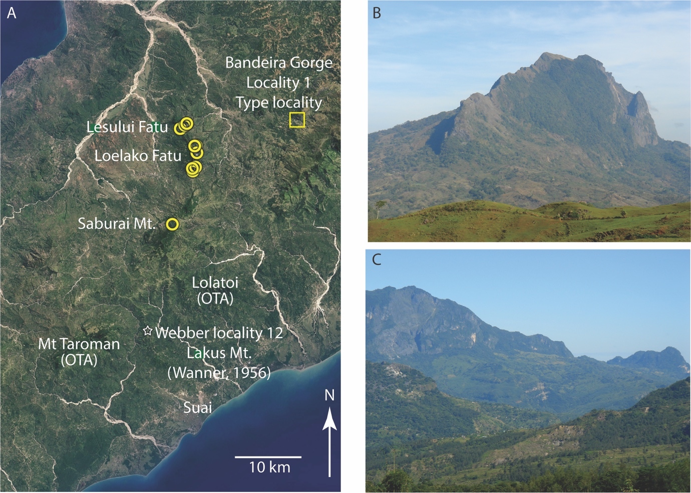 Figure 8.Localities 2, 3, 4 and 5 of the Bandeira Formation (see Fig. 1 for locations within Timor-Leste). A, Google-Earth image showing the positions of Lesululi Fatu (Locality 2), Loelako Fatu (Locality 3), Saburai Mountain (Locality 4), and Webber’s locality 12 on Lakus Mountain (recorded by Wanner, 1956; Locality 5 of this study). Sample sites of this study are shown by yellow circles (see Appendix 2 for precise locality co-ordinates). Also shown is the position of Locality 1 (type locality of the Bandeira Formation). Areas of the Overthrust Terrane Association (OTA) are present around Mt Taroman and Lolatoi. B, view looking north-west toward Loelako Fatu with steeply dipping slab of Bandeira Formation limestone along spine, and areas of basinal Triassic units (Babulu and Aitutu groups) immediately adjacent the fatu. C, view looking west toward Loelako Fatu (to the left) and the lower Lesululi Fatu (to the right).
