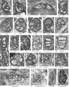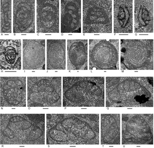 Figure 12.Foraminifers from the Bandeira Formation on Saburai Range (Locality 4, Figs. 1, 8). Bar scale = 0.1 mm. All sections from Sample 147, except P from Sample 146. A, “Tolypammina” gregaria (Wendt); see Fig. 4C for discussion on the generic designation. B–D, Rectoglomospira cf. senecia Trifonova. This species differs from typical R. senecia in its much larger size. E–J, although resembling species of the agglutinated/microgranular Gandinella, remnants of lamellae and perforations seem to be present. Therefore, these morphotypes are placed in Parvalamella spp., with wall microstructure largely micritized. K–L, “Everticyclammina” cf. simplex (Urosevic). M, N, Aulotortus spp. (M, probably A. sinuosus Weynschenk) with micritized and partially recrystallized walls. O, Q–S, Aulotortus communis (Kristan) with partially recrystallized walls, but with 2nd-order lamellae (in the terminology of Piller, 1978) very apparent, and in some of the specimens 1st-order lamellae are also apparent at least in some parts of the sections. The lamellae appear to wedge out in the axial region of the test. Pores through the wall are also apparent in most of the sections. Differences in involutinid preservation in a single rock sample are also present among specimens from the Turiscai area. P, Aulotortus sp. T, ? Diplotremina sp. U, W, indeterminant Duostominina; details of the umbilical side are not apparent. V, Diplotremina subangulata Kristan-Tollmann.