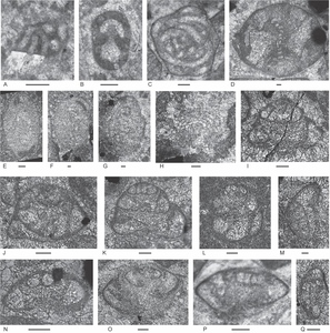 Figure 7.Locality 1 foraminifers. Foraminifera from Unit 5 of the Bandeira Formation at Bandeira Gorge (Locality 1, Fig. 1). A–C, carbonate-cemented agglutinated/microgranular species; D–H, involutinids; I–Q, duostominids. Bar scale = 0.1 mm. A, Attached tubular carbonate-cemented/microgranular species., from Sample 35. B, ? Endoteba sp., from Sample 35. C, Morphotype similar in coiling to Gandinella, but test may be micritized and may belong within Parvalamella, from Sample 35. D, Rakusia oberhauseri Salaj, from Sample 35. E, Aulotortus cf. communis (Kristan), from Sample 35. F, Aulotortus cf. sinuosus Weynschenk, from Sample 35.G, Aulosina oberhauseri (Koehn-Zaninetti & Brönnimann), note the clear presence of narrowed lumen delimited by poorly preserved strengthenings (see Rigaud et al. 2013 for details), from Sample 37. H, poorly preserved Aulosina oberhauseri. Note relics of strengthenings (arrows), from Sample 37. I–L, Cassianopapillariinae; either a species of Diplotremina or Cassianopapillaria; from Sample 35. M, Indeterminant Duostominina, from Sample 35. N–P, Diplotremina subangulata Kristan-Tollmann, from Sample 35. Q, Praereinholdella sp., from Sample 35.