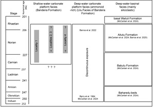 The known age of the Bandeira Formation is from Carnian to within the Rhaetian of the Late Triassic (Haig et al. 2021a, Barros et al. 2022, and this study; Fig. 2). The Perdido Limestone is Sinemurian–Pliensbachian (within the Early Jurassic; Haig et al. 2021b, Nano et al. 2023, Haig et al., 2024). There is no overlap in age range between these formations. The relationships between the Bandeira, Cablac and Perdido limestones shown, for example, by Tate et al. (2015), Duffy et al. (2017), Charlton et al. (2018) and Bucknill et al. (2019) are not supported by documented field observations of stratigraphic relationships nor biostratigraphic or other age analyses.