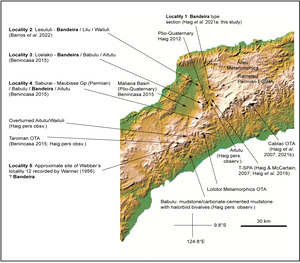 The roughly north-south trend of the Lesululi Fatu to Saburai Range and perhaps to the Lakus Range (Fig. 13), with prominent topography formed by limestones of the Bandeira Formation, cuts across the regional structural grain of Timor. This suggests that very major cross-cutting high-angle faults are present immediately to the east of this topographic trend, as well as along the eastern margin of the Maliana Basin and the Taroman OTA to the west of the Bandeira localities 2–5 topographic “ridge” (Fig. 13). Previous maps failed to differentiate these structures, perhaps because the Loelako and Lesululi fatus were interpreted as eroded Miocene remnants of an overthrust sheet called the Banda Terrane and not part of the Triassic EGIRA. Haig et al. (2021a, 2024) and Nano et al. (2023) have pointed out the evidence against a continuous overthrust sheet and for smaller overthrust-terrane blocks that were separately emplaced on the Timor orogen during collision from 8±2 Ma.