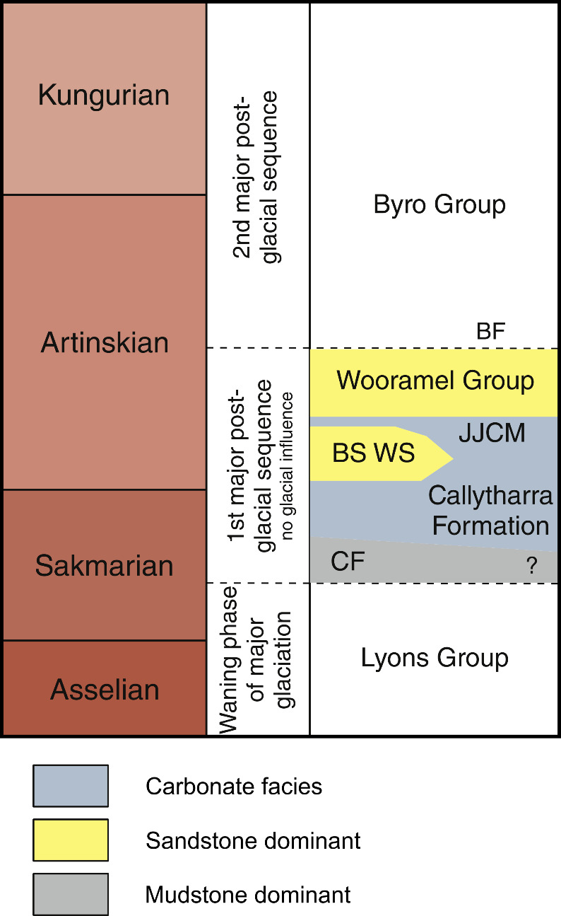 Permian strata of Western Australia were deposited within the East Gondwana interior rift system (Haig et al. 2014) which represents a broad N-S zone of late Paleozoic and early Mesozoic interior-rift and interior-sag basins in East Gondwana that during the Jurassic-Cretaceous developed into the western margin of the Australian continent (Stagg and Colwell 1994; Langhi and Borel 2005). The Callytharra Formation was deposited above glacially influenced sediments in a narrow rift basin (Merlinleigh Basin) far from the open ocean (Haig et al. 2014, their fig. 2; 2017, their figs. 1, 2).