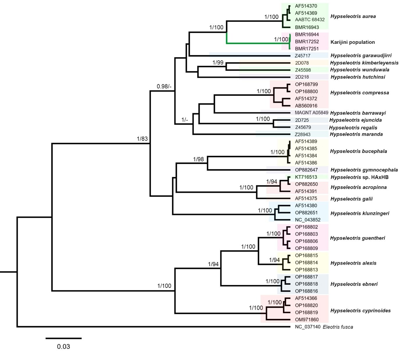 Here, we present phylogenetic analyses of specimens resembling Hypseleotris collected from a gorge pool in Karijini National Park (hereafter referred to as ‘the Karijini population’), approximately 15 km upstream of the 1981 Australian Museum record of H. aurea (Fig. 1). Due to its unique and isolated occurrence, our aim was to determine whether the Karijini population belongs to the genus Hypseleotris and, if so, to investigate its phylogenetic relationship to H. compressa and H. aurea, and other Hypseleotris from the Australasian region.